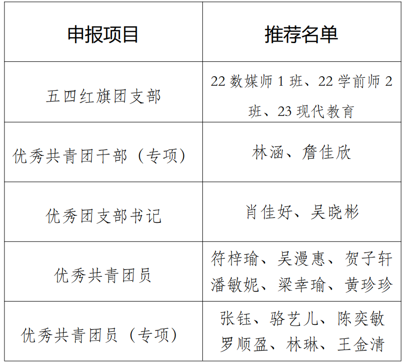 根据校团委《关于开展我校2024-2025年度五四评优表彰工作的通知》要求,经个人自荐和团支部推荐,院团委评定后,拟推荐22学前教育(师范)2班3个团组织及个人参评我校2024-2025年度五四评优,以上集体和个人均符合参评要求,推选具体名单公示如下(见附件)”。