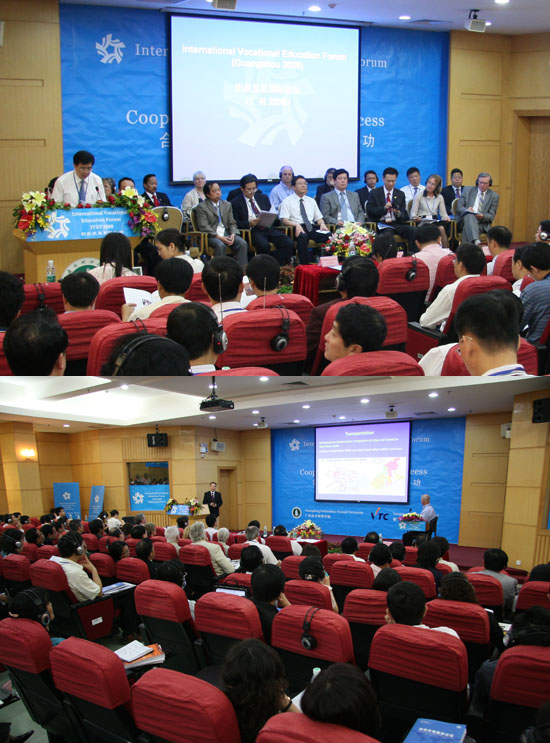 王乐夫校长应邀在大会上作了“适应广东支柱性行业和现代服务业发展的知识技能型人才需求分析与培养探索”的英文报告。他指出职业教育是教育的一大门类,它对于产业的发展和社会的和谐尤为重要。就业是民生之本,每个就业者都应该有从业之技能。职业教育是以就业能力培养为目标的教育,是重技术、重技能、重应用的教育。在对广东经济社会发展和高技能人才分类及技能人才现状的需求分析后,结合学校的教育实践,指明了学校的定位与培养目标,并提出了培养高素质职教师资的新举措。