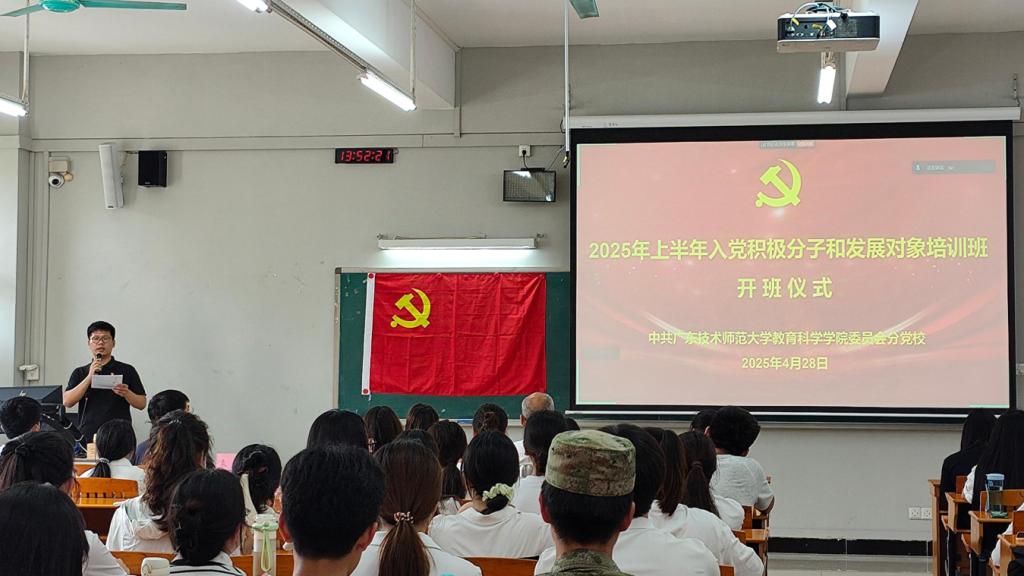 为深入学习贯彻习近平新时代中国特色社会主义思想和党的二十大和二十届二中、三中全会精神、中央八项规定精神,把牢发展党员“入口关”“质量关”,2025年4月28日,royal皇家88平台分党校于白云校区第三教学楼206教室和河源校区唯实楼205教室组织召开了2025年上半年入党积极分子和发展对象培训班开班仪式暨专题党课培训第一讲。学院党委书记张旭日、研究生第一党支部支部书记梁爽、教育技术学本科生党支部支部书记热依拉·艾比布力、应用心理学本科生党支部支部书记肖孟琦、学前教育本科生党支部支部书记袁炜、专职组织员宁康出席会议。会议由宁康主持。